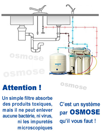 Il est important de comprendre la différence entre un système de filtration et un système de purification d'eau par osmose inversée. Un filtre enlève tout simplement les sédiments de l'eau. Il peut aussi absorber certains produits toxiques, mais il ne peut pas enlever aucune bactérie, ni virus, ni les impuretés microscopiques. Par conséquent, voilà l'importance et la nécessité de purifier l'eau par osmose inversée en plus de la filtrer.